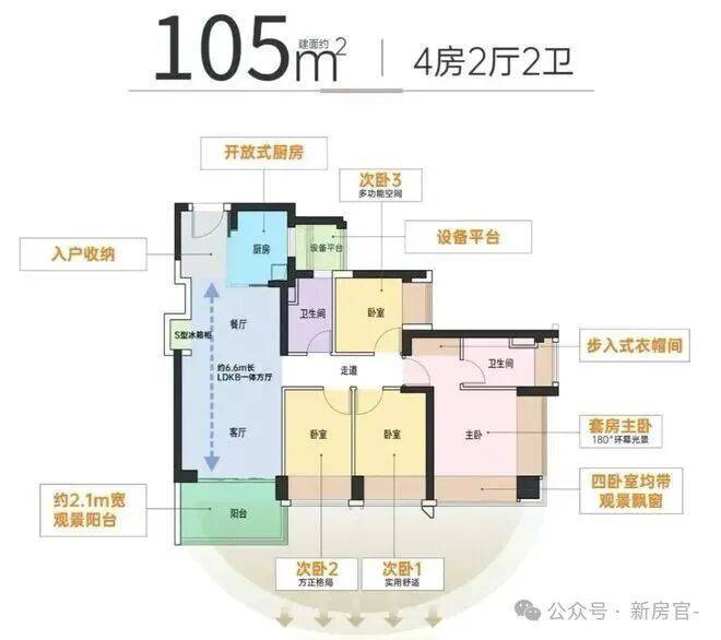 4开间约12m,全东南向采光,视野开阔,大套房主卧180度环幕采光景观,S型墙体设计冰箱位,使用空间利用更合理,客餐厅一体化设计,空间利用更高效,家人间互动交流感更强。