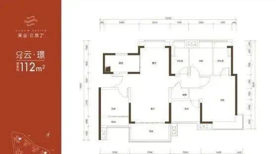 112㎡的4房2厅2卫,C2户型,仅5栋A单元/7栋的06号房才有,设计的是竖厅南北通透格局,客厅3.9米开间,餐客厅一体化设计,4个卧室分别做到了3.4米/3米/2.9米/2.4米的宽度,U型厨房,卫生间干湿分离,得房率:79.89%(不含赠送),阳台主朝东南向。