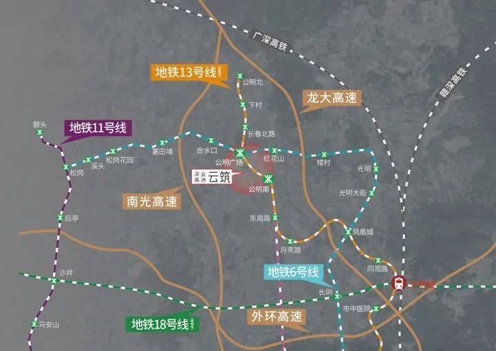 双高速:邻近龙大高速、南光高速两大城市动脉,畅达福田南山核心区双地铁:地铁6号线公明广场站约1.1km、13号线公明南站(在建)约700m,创享湾芯生活主干道:毗邻公明南环大道、松白路等主干道,高效通达全城