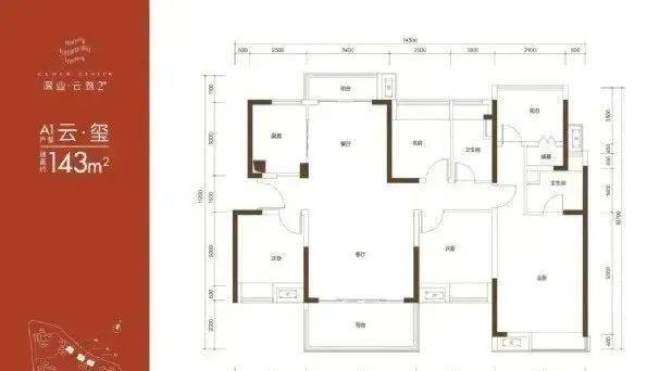 143㎡的5房2厅2卫,A1户型,设计的是竖厅格局,南北通透双阳台,客厅4.5米开间,餐客厅一体化设计,5个卧室分别做到了3.7米/3.2米/2.9米/2.9米/2.5米的宽度,U型厨房,卫生间干湿分离,得房率:80.4%(不含赠送),阳台主朝正南向。