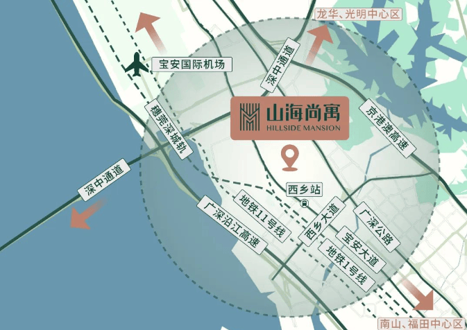 轨道:直线约600m直达穗莞深城轨西乡站(在建中),1站宝中,2站前海,未来链接深圳湾超级总部、深圳皇岗口岸站。直线约1km地铁1号线固戍站,畅达宝中、南山、福田、罗湖