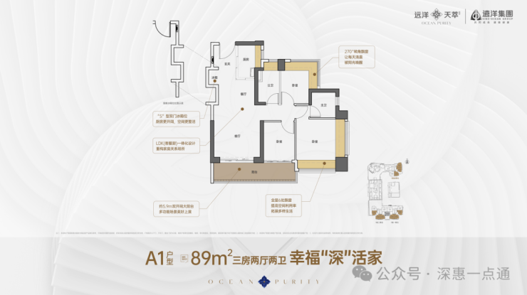 89㎡的3房2厅2卫,A2户型,设计的是竖厅格局,客厅3.5米开间,LDKB一体化,S墙设计预留冰箱卡槽位,动静分区,次卧270度转角飘窗,3个卧室分别做到了主卧12.54㎡/次卧7.24㎡/次卧6.08㎡(实测面积,去掉墙体),客厅连接次卧出5.9米长的大阳台,U型厨房,卫生间干湿分离,得房率约72.16-72.57%(不含赠送),正西向、正东向或正南向。套内面积64.89㎡+赠送面积10.68㎡=实得75.57㎡,加上赠送后得房率约84.53%。