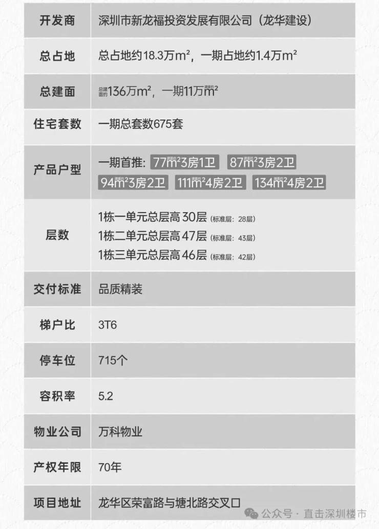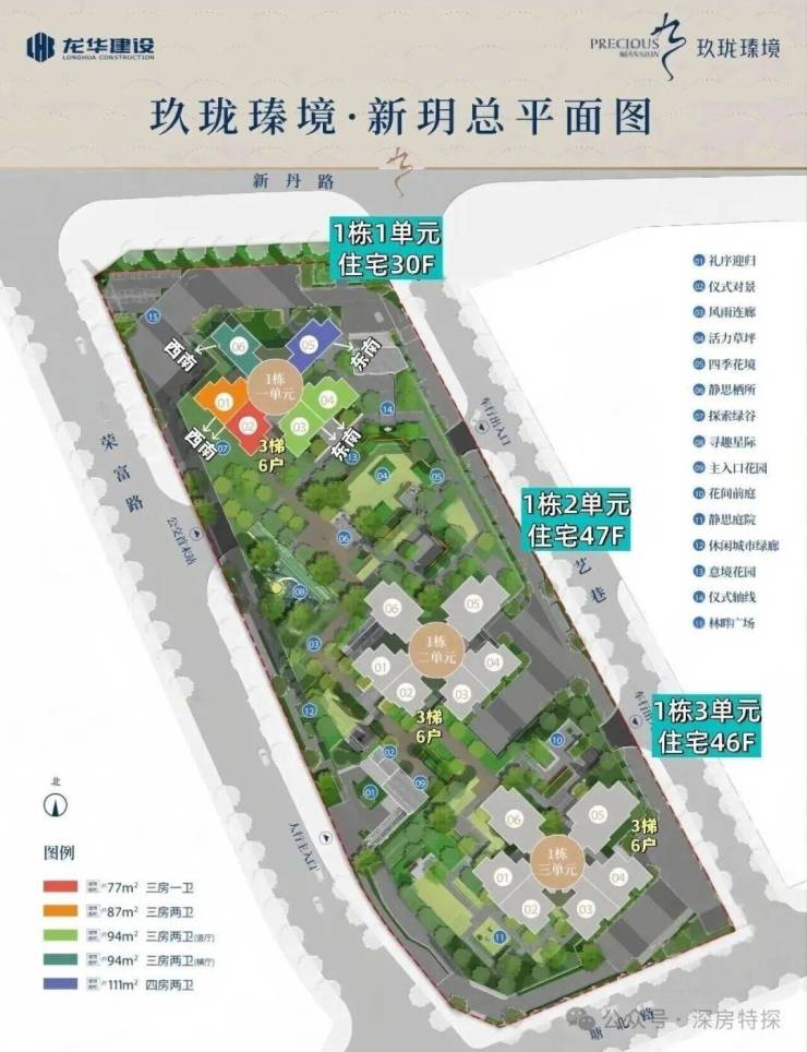 龙华观澜,玖珑瑧境·新玥(备案名:福城境未来家园)计划将在2026年3月份取证入市,本次首推1栋1单元,共167套房源,面积有77㎡的3房1卫,87-94㎡的3房2卫,111㎡的4房2卫户型,全南朝向,也是观澜第二个新规建设的新盘,得房率高达98-105%。