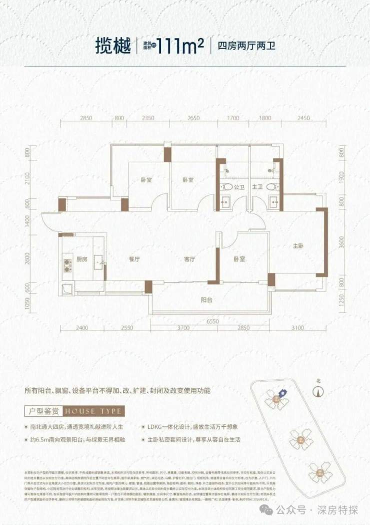 111㎡的4房2厅2卫,设计的是横厅南北通透格局,独门独户,进门入户玄关,客餐厅6.2米开间,LDKB一体化,全屋10面飘窗,主卧南北通,客厅连接次卧出6.8米长的大阳台,U型厨房,卫生间干湿分离,得房率约95.73%(包含赠送),阳台主朝东南向。