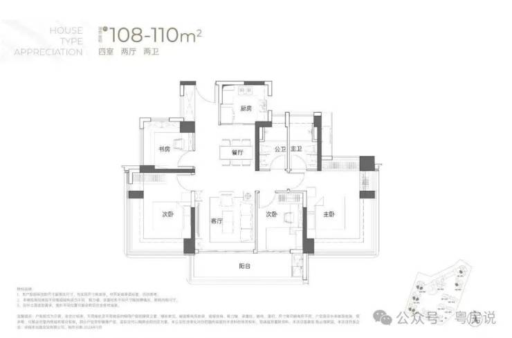 108-110㎡的4房2厅2卫:竖厅双龙抱珠格局,客厅开间3.5米,LDKB一体化,4个卧室分别做到了3.7米/3.4米/2.8米/2.6米的宽度,主卧加2个次卧270°全景飘窗,客厅连接次卧出6.1米长的大阳台,U型厨房,得房率约95-97%(包含赠送),西南或东南朝向。户型分布在1栋1/2/3单元03/04户型,03户型东南朝向,04户型西南朝向;只有2栋2/3单元看小区,其他都看向小区外部;