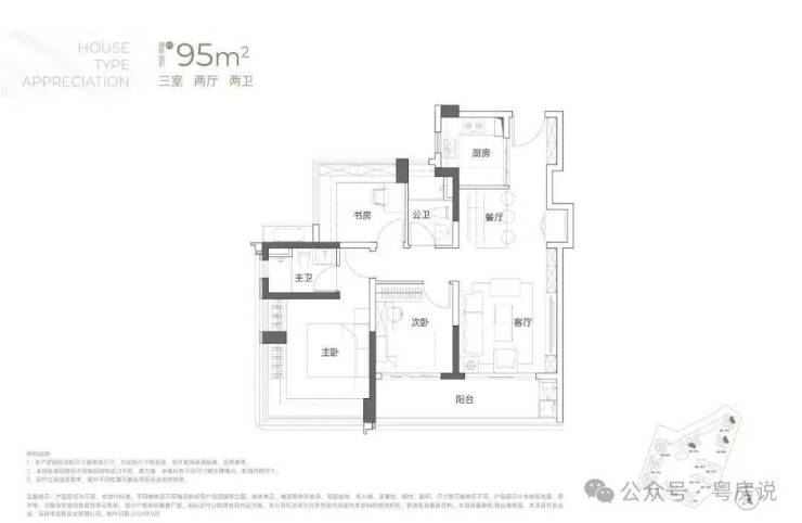 95㎡的3房2厅2卫:传统竖厅格局,客厅开间3.5米,LDKB一体化,S墙设计预留冰箱卡槽位,3个卧室分别做到了3.6米/2.8米/2.8米的宽度,主卧加1个次卧270°全景飘窗,客厅连接次卧出6.3米长的大阳台,U型厨房,得房率约95-97%(包含赠送),西南或东北朝向。户型分布在2栋2/3单元04/05户型,东北朝向看大南山、2栋1单元04/05户型西南朝向看小区;