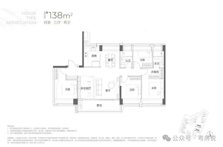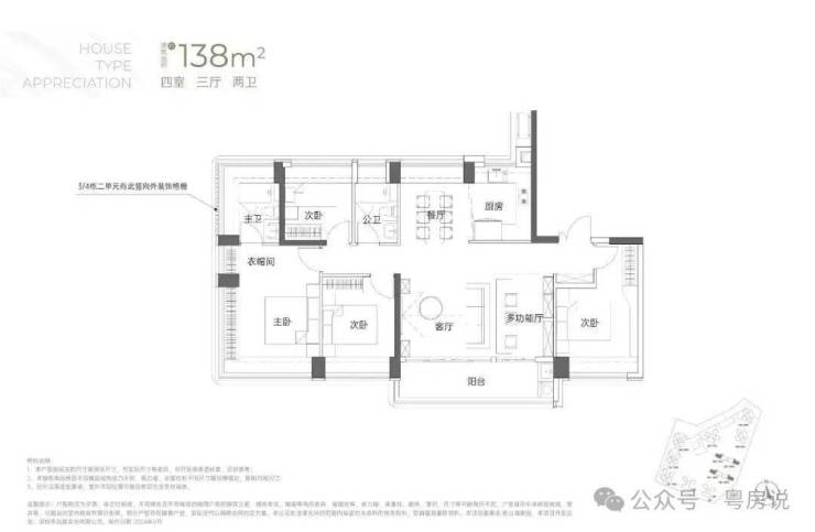 138㎡的4房2厅2卫:竖厅南北通透格局,专梯入户,客厅6.1米开间,LDKB一体化,全屋飘窗,4个卧室分别做到了3.9米/3.25米/2.9米/2.8米的宽度,主卧加1个次卧270°全景飘窗,客厅出6.1米长的大阳台,U型厨房,得房率约95-97%(包含赠送),阳台主朝西南向。138平米户型分布在3栋1单元、3栋2单元、4栋1单元、4栋2单,4个单元纯大户型。