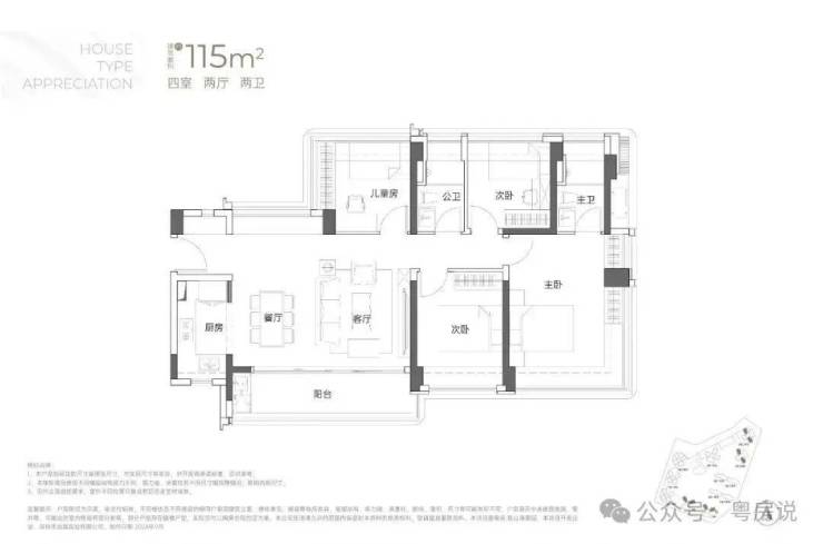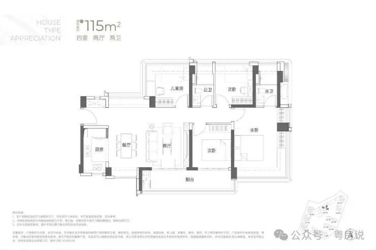 115㎡的4房2厅2卫:横厅南北通透格局,客餐厅6米开间,LDKB一体化,全屋飘窗,4个卧室分别做到了3.9米/3米/2.8米/2.6米的宽度,主卧加1个次卧270°全景飘窗,客厅出6米长的大阳台,L型厨房,得房率约95-97%(包含赠送),西南或东南朝向。115平米户型分布在1栋1单元、1栋2单元、1栋3单元01/02户型,01户型西南朝向都是看小区外围,02户型看向小区;