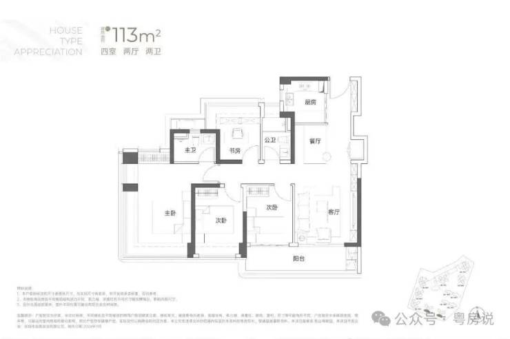 建面113平米:4房2厅2卫,传统的竖厅户型动静分区,‘S’型墙体,有冰箱预留位;市面非常常见的竖厅4房户型,比较突出的是有大阳台连接客厅和次卧;主卧和书房(卧室)都是多飘窗设计,保证了视野和多方面的采光;这种户型的缺点是走廊过长,空间利用率比横厅或者双龙抱珠户型差些;户型分布在5栋、6栋03/04户型,均是西南朝向,看小区外面大南山方向,比较安静;