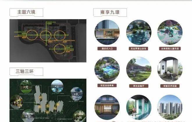 景观园林以“借山还山,师法自然”为设计理念,以“三轴三环”为结构,以”六境九璟“为核心景观主题,打造约2万㎡全龄乐活生态公园。