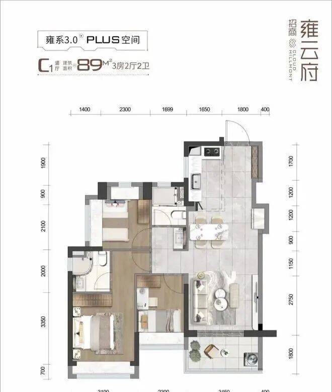 89㎡的3房2厅2卫(C1户型),设计的是经典竖厅格局,客餐厅一体化,客厅3.45米开间,S墙设计预留冰箱位,3个卧室分别是3.1/2.3/2.3米的宽度,L型厨房,公卫三段式分离设计,西南或东南朝向。