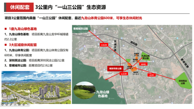 公园及城市配套:项目600米内有九龙山体育公园,内有公园足球场,游泳馆,九龙山龙华环城绿道距离约2.2公里,民法公园距离约2公里,周边3.9公里范围内还有鹭湖四馆,是龙华最大的文化建筑群。
