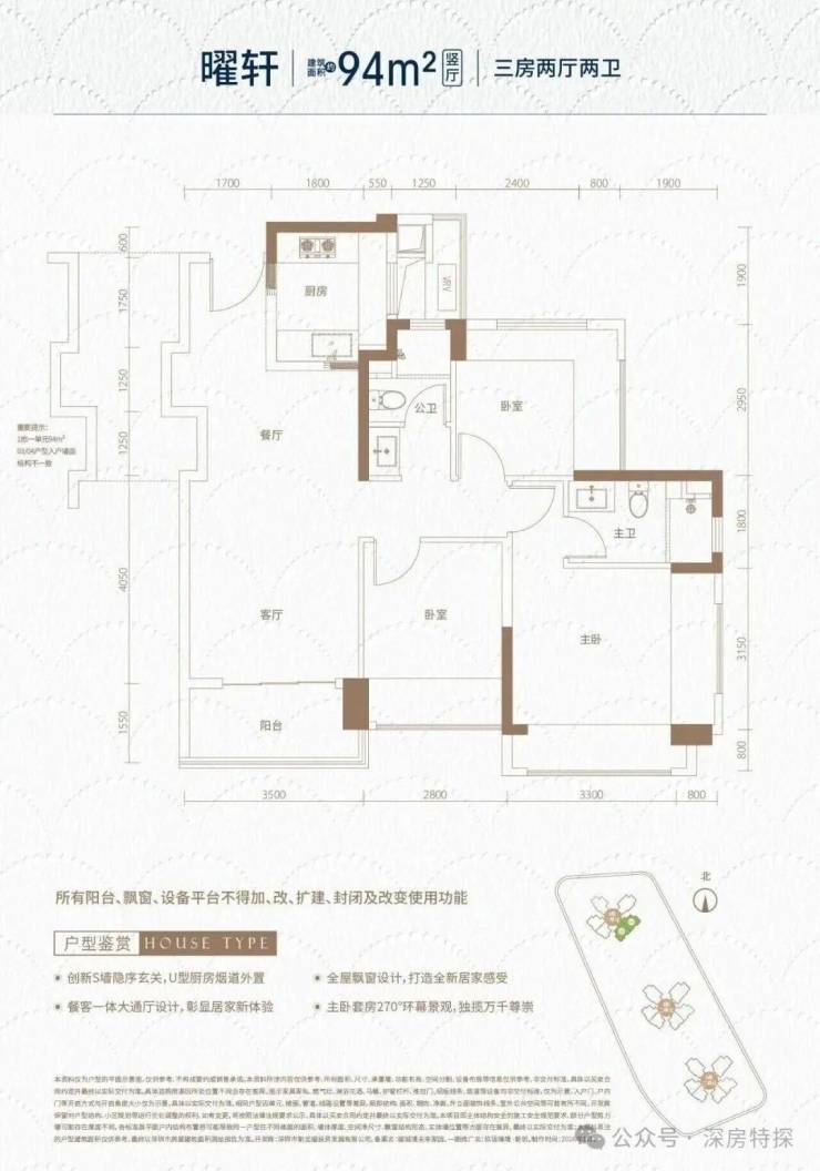 94㎡的3房2厅2卫(-2),设计的是横厅南北通透格局,独门独户,进门入户玄关,客餐厅5.7米开间,LDKB一体化,全屋10面飘窗,主卧南北通,U型厨房,卫生间干湿分离,得房率约93.73%(包含赠送),阳台主朝西南向。