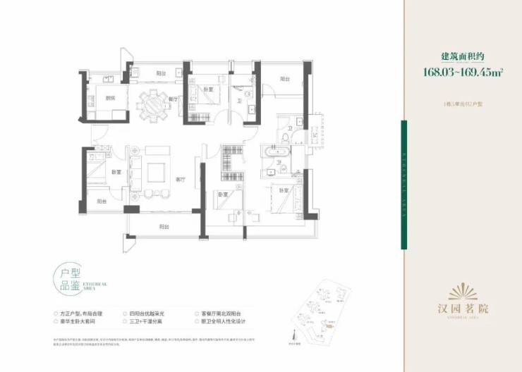 项目户型方正、布局合理,动静分区,其中168㎡五房户型为四阳台设计,客餐厅南北通透双阳台,豪华主卧大套房。