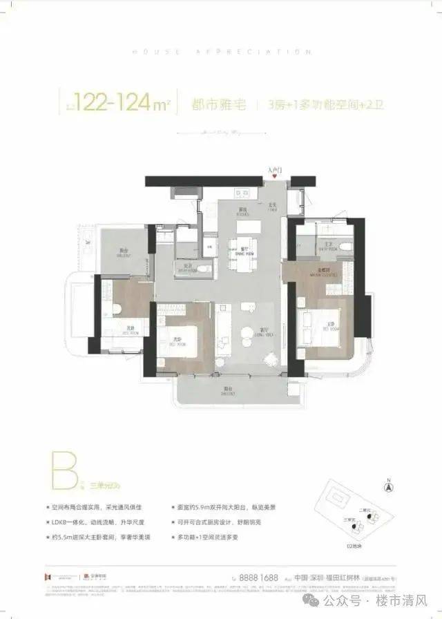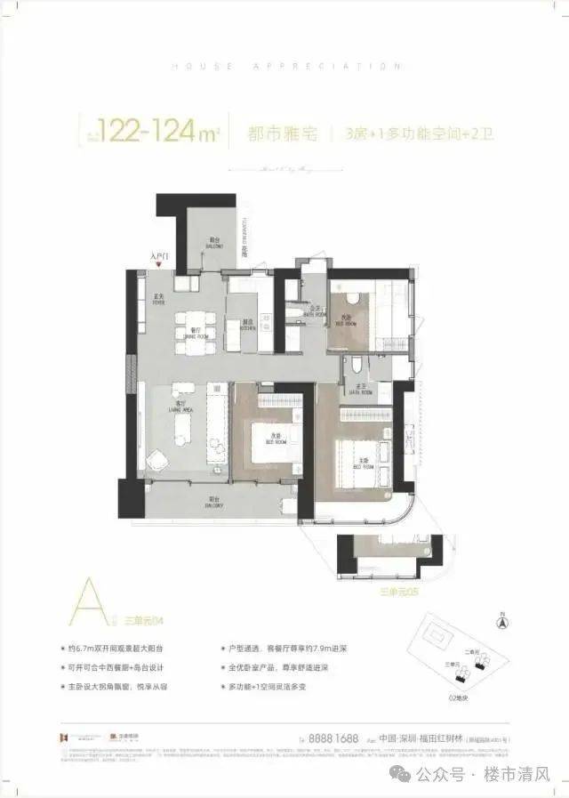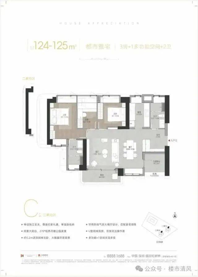 建面约125㎡C户型以时尚大横厅设计为核心亮点,营造出开阔通透的大宅空间感,搭配独立玄关设计彰显归家仪式感。270°阔景阳台将红树林生态公园与海景尽收眼底,主卧采用约5.2米进深设计,大飘窗尽享美景,提升居住舒适度。