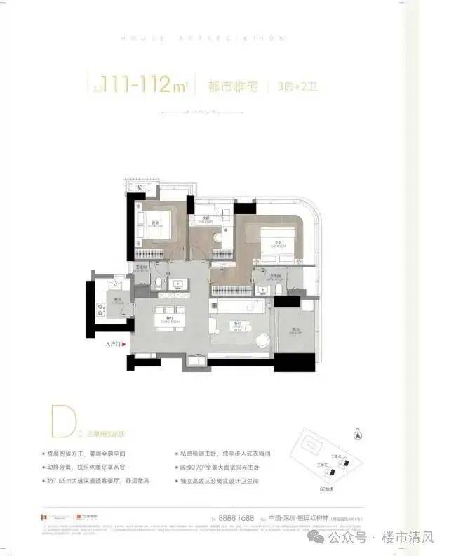 建面约111-112㎡三房两卫户型户型方正,动静分区,客厅与景观阳台相连,采光通风俱佳,尽揽城市繁华景观;建面约111㎡D户型主卧配置独立衣帽间与三分离卫浴系统,配合科学动静分区,演绎品质生活美学。