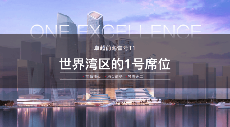 卓越前海壹号位于深圳未来的国际创新金融区,前海桂湾片区。作为前海首拍地块,首席商务门户,和首个入市的高端商务综合体,集前海三大第一于一身。项目总建筑面积约66万m²,集办公、居住、商业于一体,由有6栋塔楼组成,其中含4栋超甲写字楼,2栋高端国际行政公寓及卓越Intown商业旗舰店。一期为两栋约180m超甲级写字楼,二期约47-658m²国际行政公寓,T3栋超甲级写字楼自持;约283m高T1栋楼王写字楼,约579-2614m²高区塔尖资产,全球启幕。