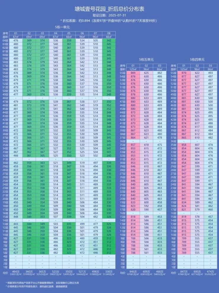 2、折后1单元均价53477元/㎡,折后5单元62465元/㎡。