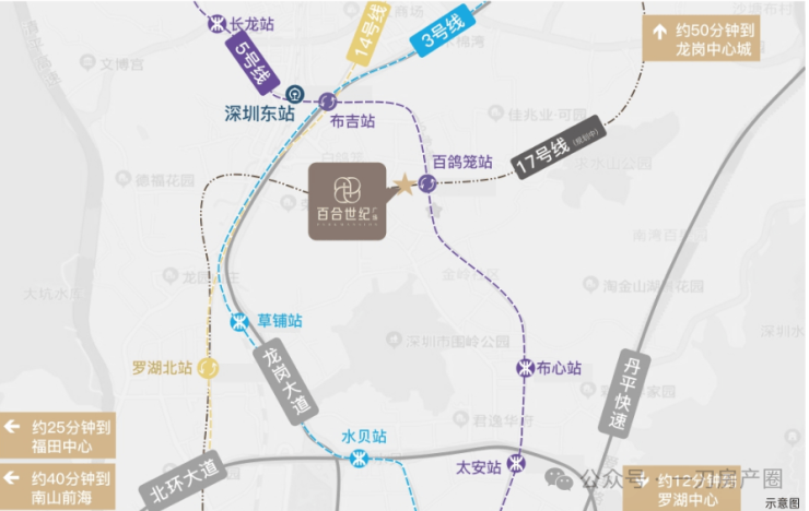 【交通】百合世纪广场紧邻地铁5号线百鸽笼站(步行约100米),且未来规划有17号线罗岗站约450米在此交汇通过地铁5号线,1站可换乘3/14号线,4站直达福田核心区,7站快速通达深圳北站。1 公里接驳龙岗大道,2.5 公里直达丹平快速。