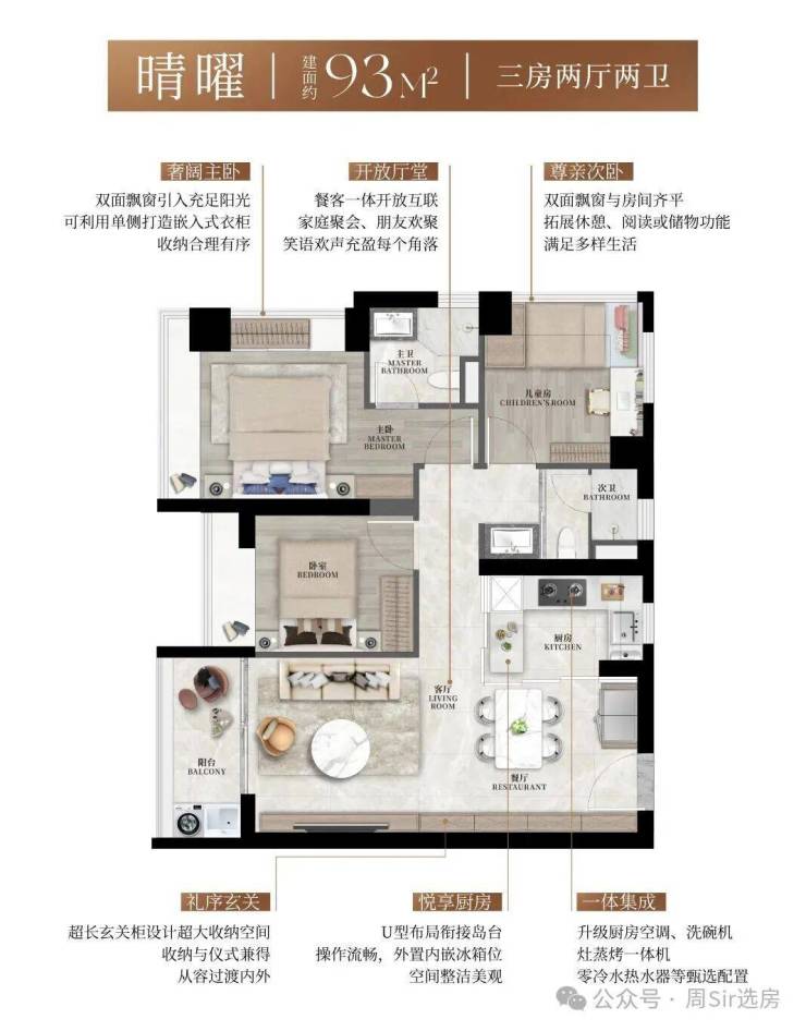 l颜值臻配:升级配置超大玄关柜、内嵌冰箱、灶蒸烤一体机、零冷水热水器、中央空调及厨房空调、轻松抽橱柜、双向流新风,以一体集成的精工美学,实现功能与颜值的并存。