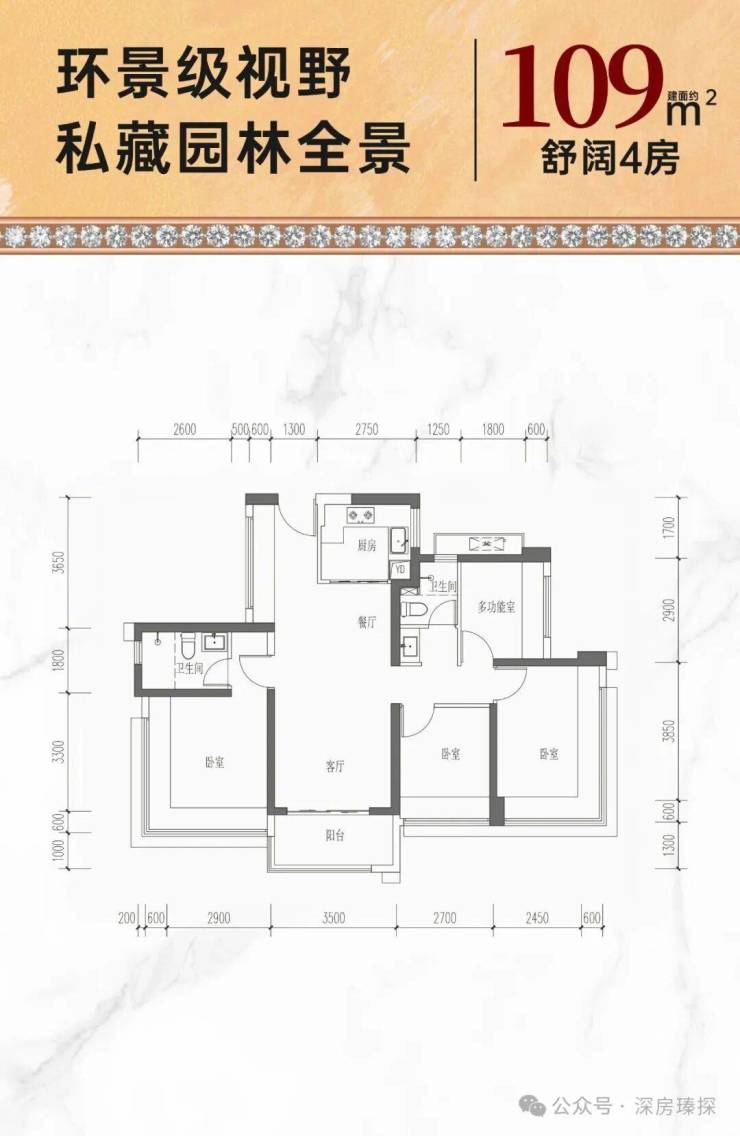 109㎡的4房2厅2卫,设计的是竖厅双龙抱珠格局,进门入户玄关,客厅3.5米开间,LDKB一体化,主卧270°无柱转角飘窗,分别做到了主卧15.45㎡/次卧13.57㎡/次卧9.31㎡/次卧6.96m²(包含墙体飘窗),U型厨房,公卫三段式干湿分离,得房率约74%(不含赠送),阳台西南朝向约5.95平。套内面积80.81㎡+赠送面积16.75㎡=实得面积97.56㎡,加上赠送后得房率约89.34%。