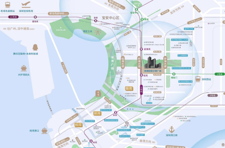 交通:地铁1/5/11号线前海湾站;深圳西站(高铁);无缝链接地铁1号线鲤鱼门站、5号线桂湾站、11号线前湾站;