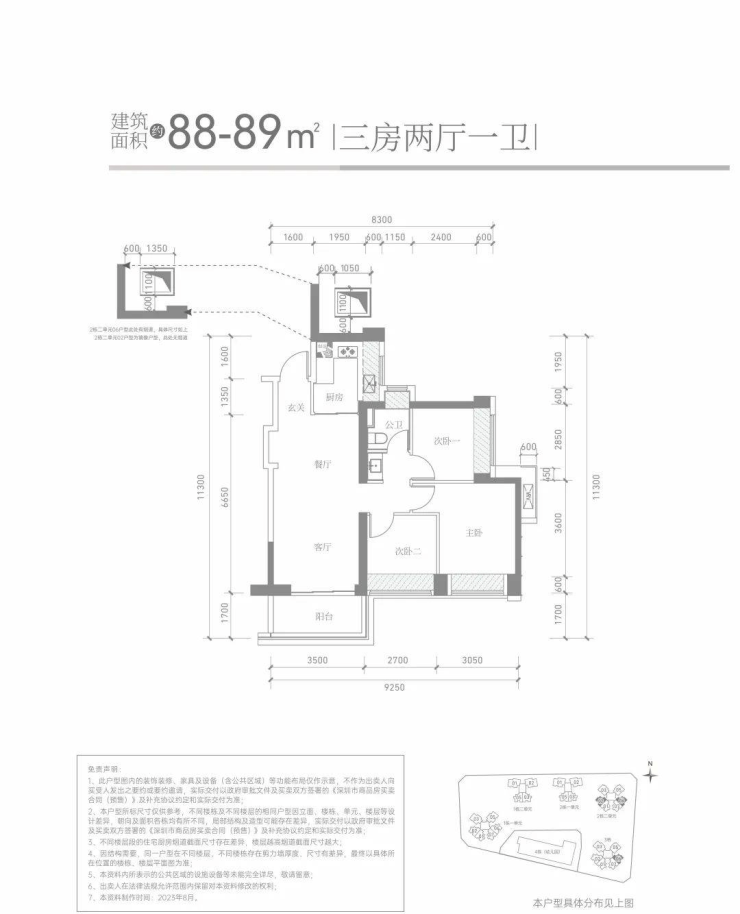 2、户型使用率并不是很高,88平做三房一卫,也是因为超高层;