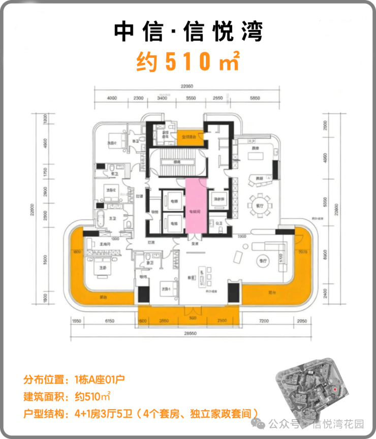约510㎡户型分布在1栋A座,3梯1户,层高3.6米,4+1房3厅5卫配比。