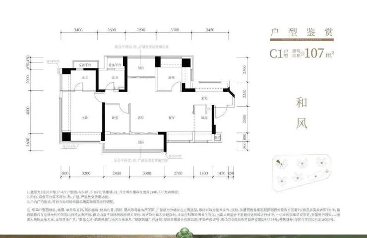 107㎡的4房2厅2卫,设计的是横厅南北通透格局,进门赠送约4㎡入户玄关,客餐厅5.9米开间,4个卧室分别做到了主卧17.9㎡/次卧9.48㎡/次卧8.47㎡/次卧6.06㎡(实测面积,去掉墙体),主卧+1个次卧270°飘窗,客厅连接次卧出5.7米长大阳台,U型厨房,得房率约102.5%(包含赠送),阳台主朝西南向。