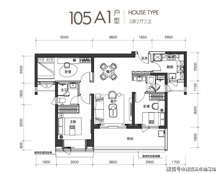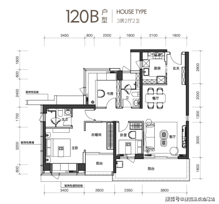 120户型为竖厅设计,约24㎡的客餐厅,6.15m+近10㎡的宽幕阳台,空间更显奢阔。