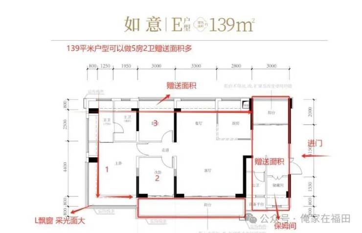 【户型139平米4+1房2卫】户型设计采用三进式格局,入户赠送面积多,可以改多一个卧室,2房朝南,6.4米客厅开间,北向1房,入户可以加1房 共计5房,其中2号为玻璃门,可以改卧室.