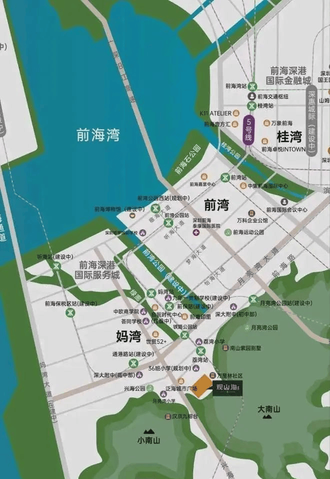 观山海家园在5号线荔湾站周边,位于深圳市南山区沿山路荔山东北侧,项目在前海合作区内,享受前海政策规划利好,毗邻大南山,靠近妈湾片区,观山海家园位于前海片区“三湾两城一山”中的大南山生态住区,与桂湾国际金融城和妈湾前海深港国际服务城两大前海核心区引擎,形成前海黄金三角