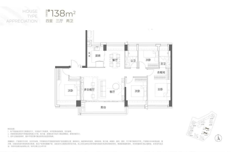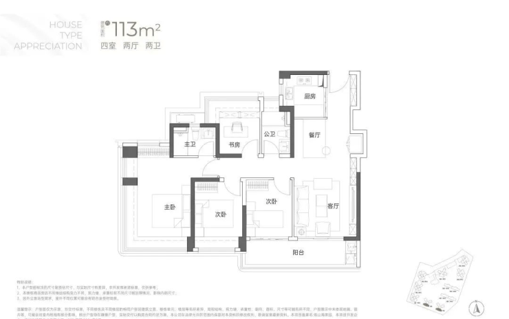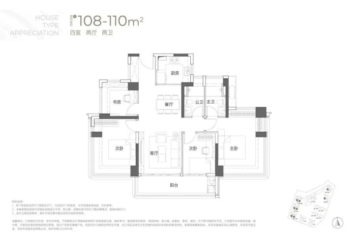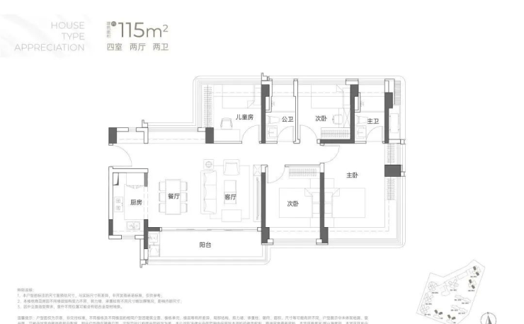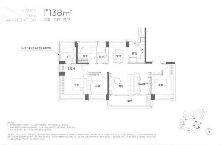 竖庭格局,西南向,基本居住功能与建面约108-110㎡4房2卫一致,但格局不一样,从目前公布的户型图上看,主要是主卧空间有了更大的提升,比如可以放更大一点的衣柜。但从位置上看,它所在的楼栋更靠近主干道,会有噪音影响。
