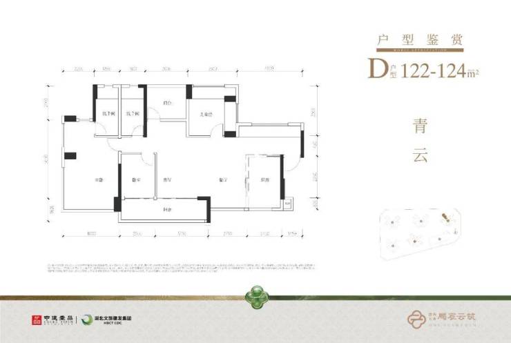 122-124㎡的4房2厅2卫,设计的是横厅南北通透格局,进门入户玄关,客餐厅6.35米开间,4个卧室分别做到了主卧20.95㎡/次卧10.58㎡/次卧9.45㎡/次卧7.2㎡(实测面积),主卧+1个次卧270°飘窗,另有1个收纳间3.43㎡,客厅连接次卧出6.3米长大阳台,L型厨房,得房率约98.6%(包含赠送),阳台主朝西南或东南向。