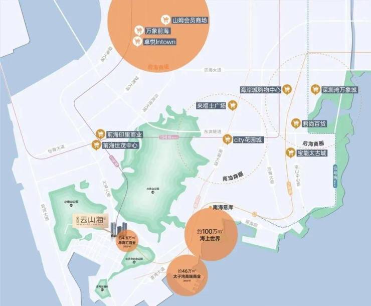 📍直线距离约6公里范围内分布有花园城、海岸城、宝能太古城、来福士广场等多个大型shoppingmall