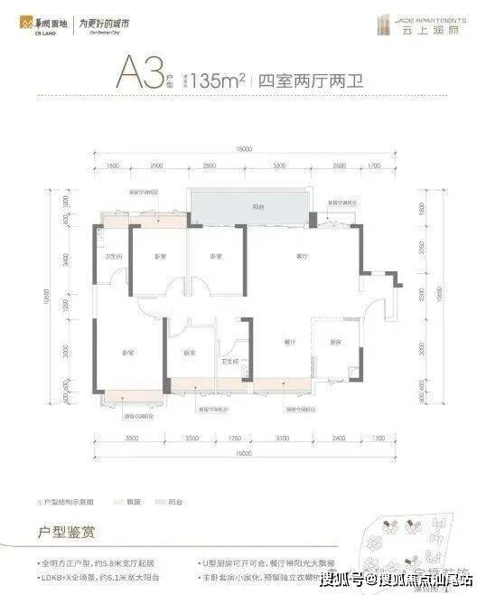 A3户型:竖厅超大宽厅格局,客厅5.8米开间,连接6.1米长的大阳台,主卧大套房设计,得房率83.65%,阳台主朝东北或西北向。