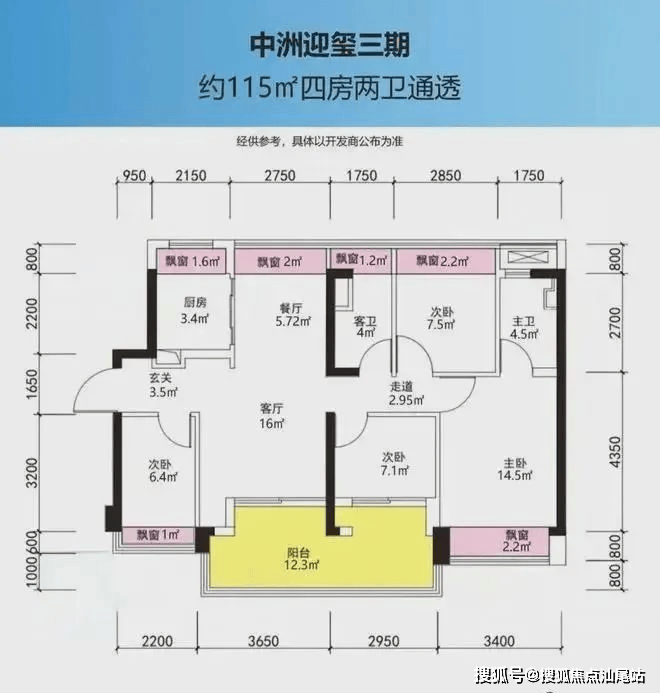 115㎡的4房2厅2卫,设计的是竖厅南北通透格局,进门入户玄关,客厅3.65米开间,LDKB一体化设计,四开间朝南,4个卧室分别做到了主卧16.7㎡/次卧9.7㎡/次卧7.4㎡/次卧7.1㎡(包含墙体飘窗),客厅连接次卧出6.6米长的大阳台,U型厨房,卫生间干湿分离,赠送面积高达16.35㎡,阳台主朝正南或东南向。