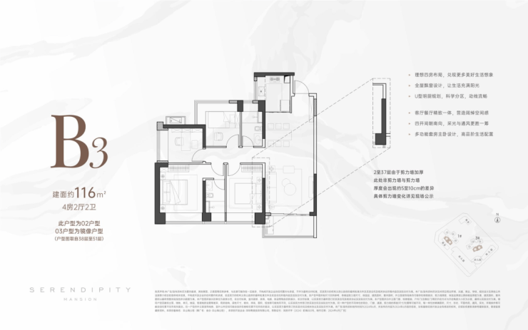 116㎡:4房2厅2卫,传统的竖厅动静分区户型,分布在1/3栋的02/03户型,东南和西南两种朝向;唯一的不足就是厨房的空间有点小,其他各个空间比较均衡,客厅的开间3.7米,一眼望去很大气,卧室的飘窗比较好利用,特别是比较小的次卧是 L 型的飘窗,采光、视野更好些;主卧较大,不过没有独立的衣帽间。