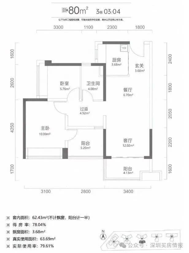 80㎡2+1房一卫:为了偷面积主卧旁设了阳台,实际上就是常规三房一卫户型。餐客厅18.72㎡,客厅开间3.4米,整个动区的观感应该还蛮阔绰。