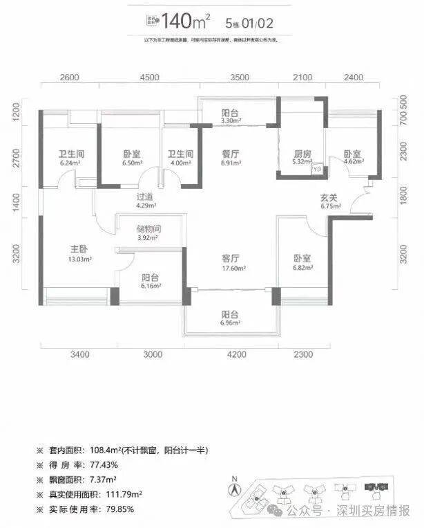 140㎡4+1房二卫:该户型是「总章翡翠公馆」的最大面积户型,实际上可以做到五房二卫。南山区很少有140㎡面积段做得出五房双阳台的设计,实际使用率也接近80%,南/北通透的户型非常舒服。
