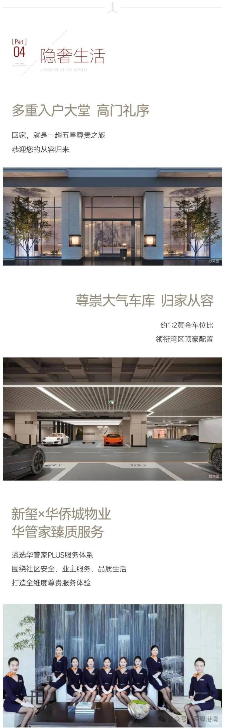 内部配套:配备高端私密会所、约 766 平方米的深圳首个悬空无边际海景泳池、首层城市花园、健身房、儿童游乐区以及 1800 平方米的海洋博物馆等设施。