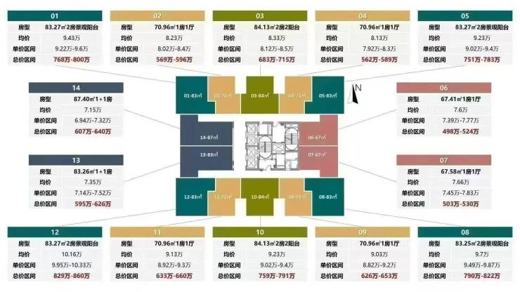 公寓户型面积为67-71㎡1房卫、83-87㎡2房1卫,位于29-42F,5梯14户。