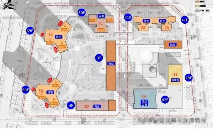 占地4.2万㎡,容积率6.63,分为两期不同地块。一期为1栋A座为150米高公寓+酒店、1栋B座为92米高保障房、2栋A/B座位为138米回迁住宅。
