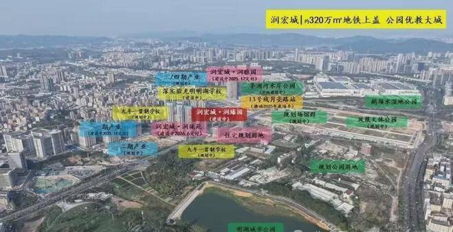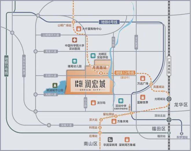 润宏城位于深圳市光明区凤凰街道13号线二期月亮路站旁,由华润置地和宏发集团联合打造,整体规划约382万㎡超大体量城市综合体,集轨道交通、优质教育、城市公园、创新产业、品质居住于一体,打造“宜居、宜业、宜游”都市生态标杆大城。