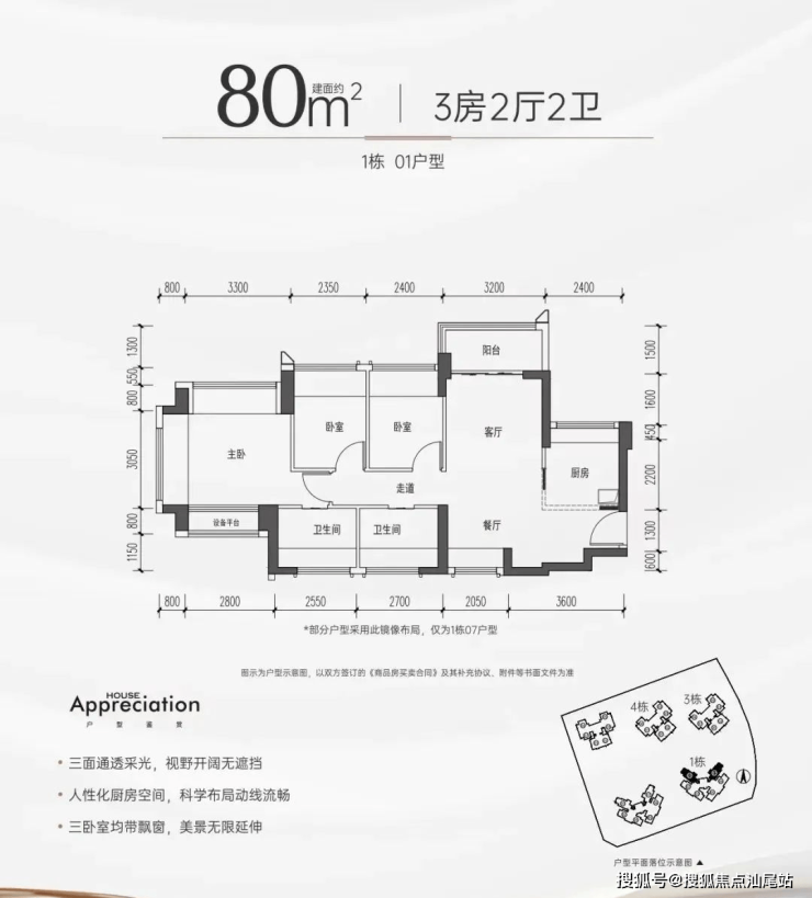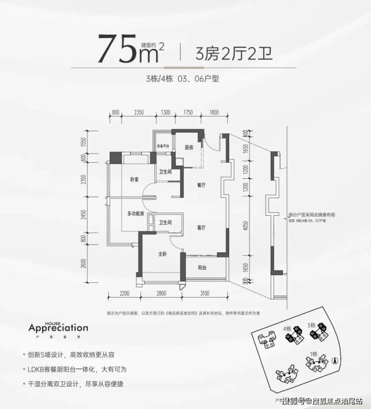 该地块有5栋住宅,全部为新规户型,得房率达到了100%-106%,属于该区域唯一新规产品。本次计划首推1栋总45层/3栋/4栋总43层,共3座楼栋,约780套住宅产品,面积有建面约75㎡3房2卫、80㎡3房2卫、83㎡3房2卫、85㎡3房2卫,3房产品共4款不同户型,另有94㎡4房2卫、105㎡4房2卫,层高43层左右,3梯6户设计。