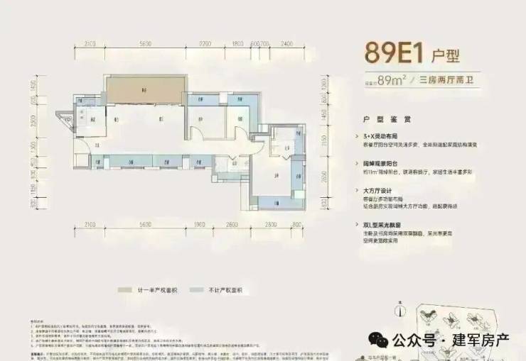 89㎡的3房2厅2卫,E1户型,设计的是横厅南北通透格局,进门入户玄关,客餐厅5.6米开间,LDKB一体化设计,客餐厅出11㎡的大阳台,主卧+1个次卧双飘窗设计,全屋12面飘窗,分别做到了主卧15.1㎡/次卧7.83㎡/次卧6.96㎡(包含墙体飘窗),L型灵动式厨房,卫生间干湿分离,得房率约:77.39%(不含赠送),阳台主朝西北向。也是可以改4房的格局,赠送面积24㎡,加上赠送得房率104.44%。