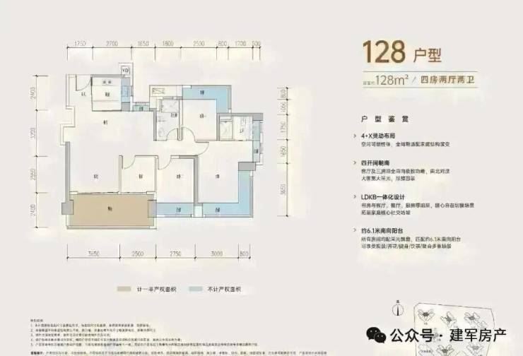 126-128㎡的4房2厅2卫,设计的是经典竖厅格局,进门入户玄关,客厅3.65米开间,LDKB一体化,S墙设计预留冰箱卡槽位,四开间朝南,动静分区,主卧+1个次卧270度大飘窗,客厅连接次卧出6.15米长大阳台,分别做到了主卧20.14㎡/次卧11.28㎡/次卧10.58㎡/次卧6.37㎡(包含墙体飘窗),U型厨房,卫生间干湿分离,得房率约:77.3-77.39%(不含赠送),东南朝向。赠送面积21.54㎡,加上赠送得房率94.45%。