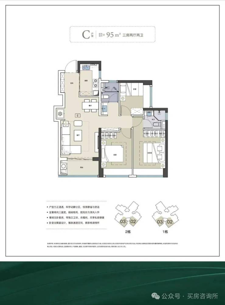 建面约95㎡还有一个3房2厅2卫的横厅户型,空间充足,阳台与餐厅两个对向飘窗可以做到南北通透,保证了整个房间的日照、通风效果。
