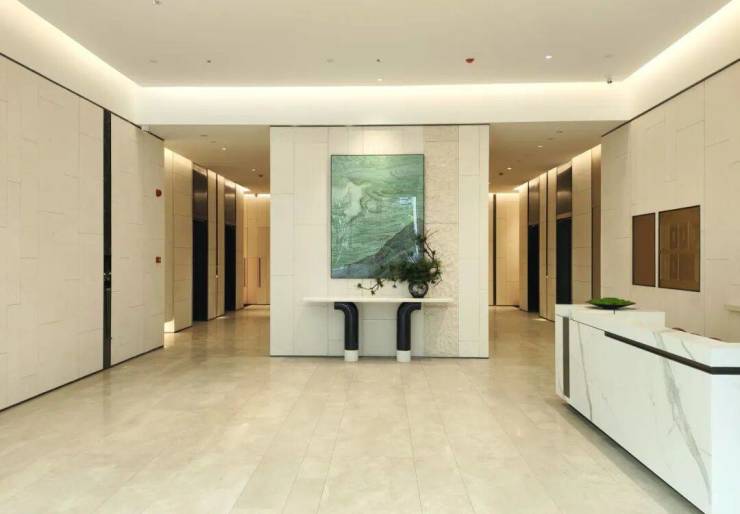 5栋建筑外立面采用大面铝板、大理石、玻璃等高规格用材标准,巧妙展现了现代美学的精髓。瀚府项目打造新中式园林景观,布置有罗汉松、小叶紫檀等树种,配置各式枯山水小景,形成一种独特的移步异景的观赏动线;入户大堂内使用哑光面、温润面及雕刻面的天然大理石交互铺贴,同时规划了泛会所空间,包括茶室、书吧等。