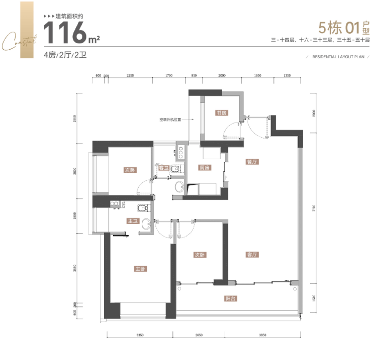 其中,建筑面积约116㎡的4房2卫,是万丰海岸城本次推出的面积最小户型,经典的竖厅格局,动静分区,进门处是一个小房间后期可以打造成书房,厨房连接餐厅,餐客厅一体化,南向约6.5米大阳台连接次卧,主卧带独立卫生间,这个户型最大的亮点就是客厅很大,客厅开间约3.85米。这个户型主要分布在01和02户型,客厅都是西南朝向看小区花园、海岸公园、万丰海岸城商业和深圳外国语宝安学校。